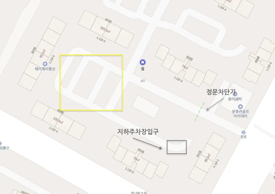입구 차단기 통과 후 좌회전 2회, 직진하면 지하 주차장 입구가 있습니다. 지도에 표기되어 있습니다.